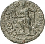 Poseidon standing, left, his right foot on prow, holding cult-statue of Artemis of Ephesus on his extended right hand, left resting on trident