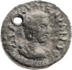 bare-headed, draped and cuirassed bust of Diadumenian, right, seen from rear