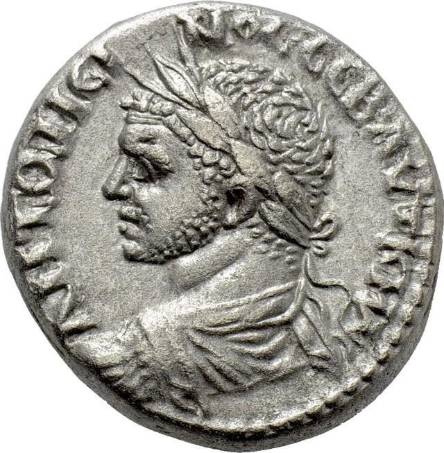laureate, draped and cuirassed bust of Caracalla, left, seen from rear