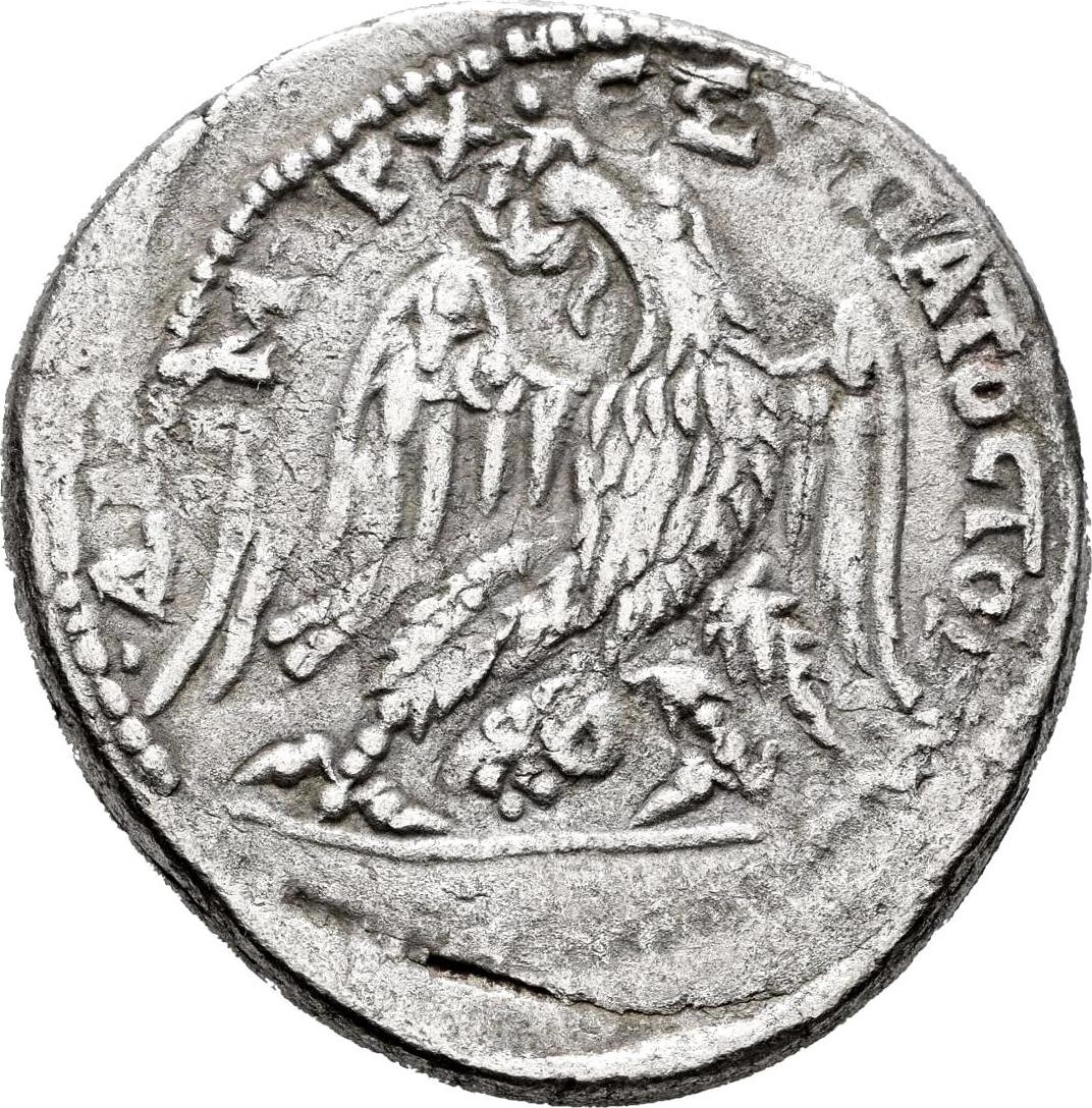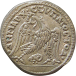 eagle standing facing, head and tail left, with wings spread, holding wreath in beak; between legs, ram's head left