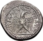 eagle seen from front, with wings spread, head right, wreath in beak, standing on filleted thyrsus