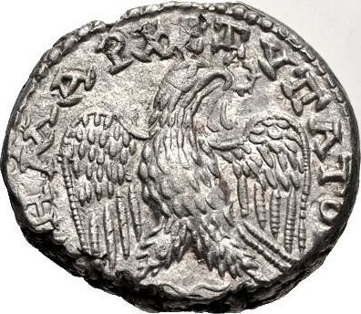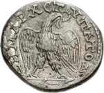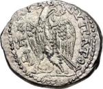 eagle seen from front, with wings spread, head right, wreath in beak, standing on filleted thyrsus