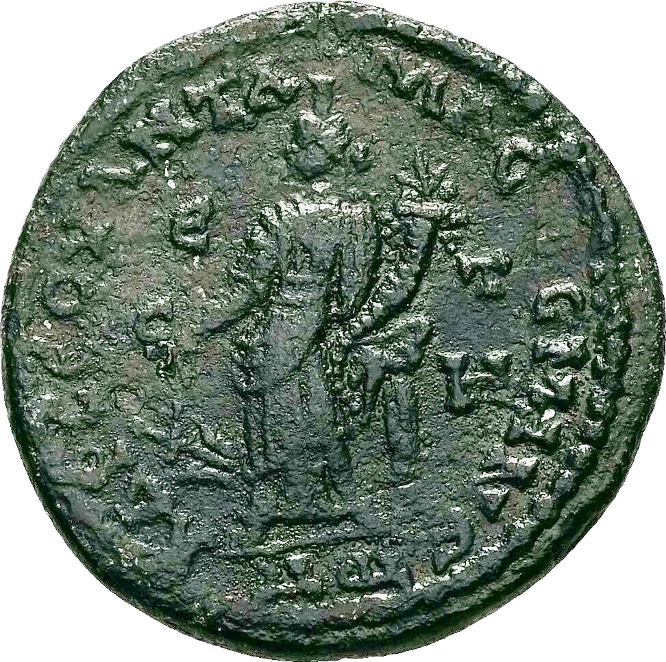 Tyche standing facing, head left, holding rudder and concucopia |