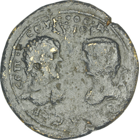 radiate, draped and cuirassed bust of Septimius Severus, right, seen from front, facing draped bust of Julia Domna, left |