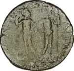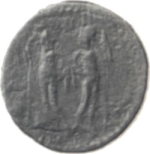 Dioscuri standing facing each other, clasping hands, each wearing pileus and holding spear