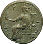 Tyche seated left, holding cult statue of Artemis Pergaia and cornucopia