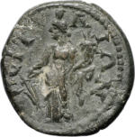 Tyche standing left, holding rudder and cornucopia