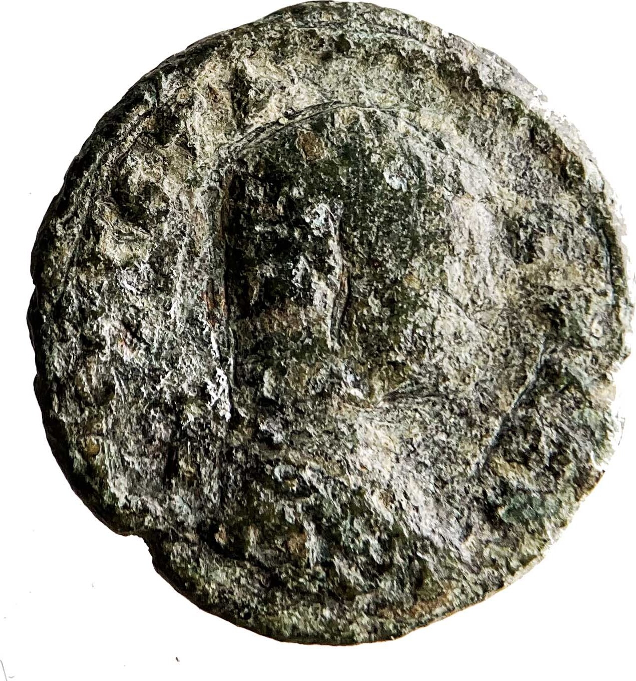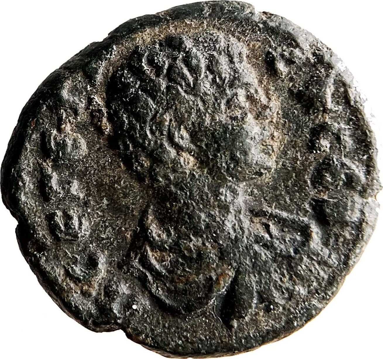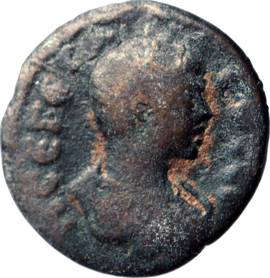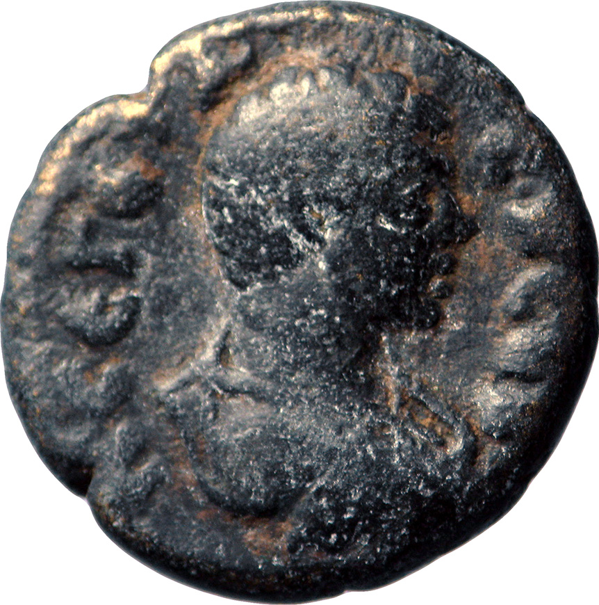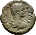 bare-headed, draped and cuirassed bust of Geta, right, seen from rear