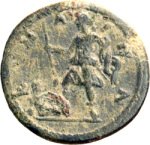 Amazone Kyme (?) advancing left, holding spear or sceptre in right hand and entwisted cloth in left hand; at her feet, left, a male Triton?