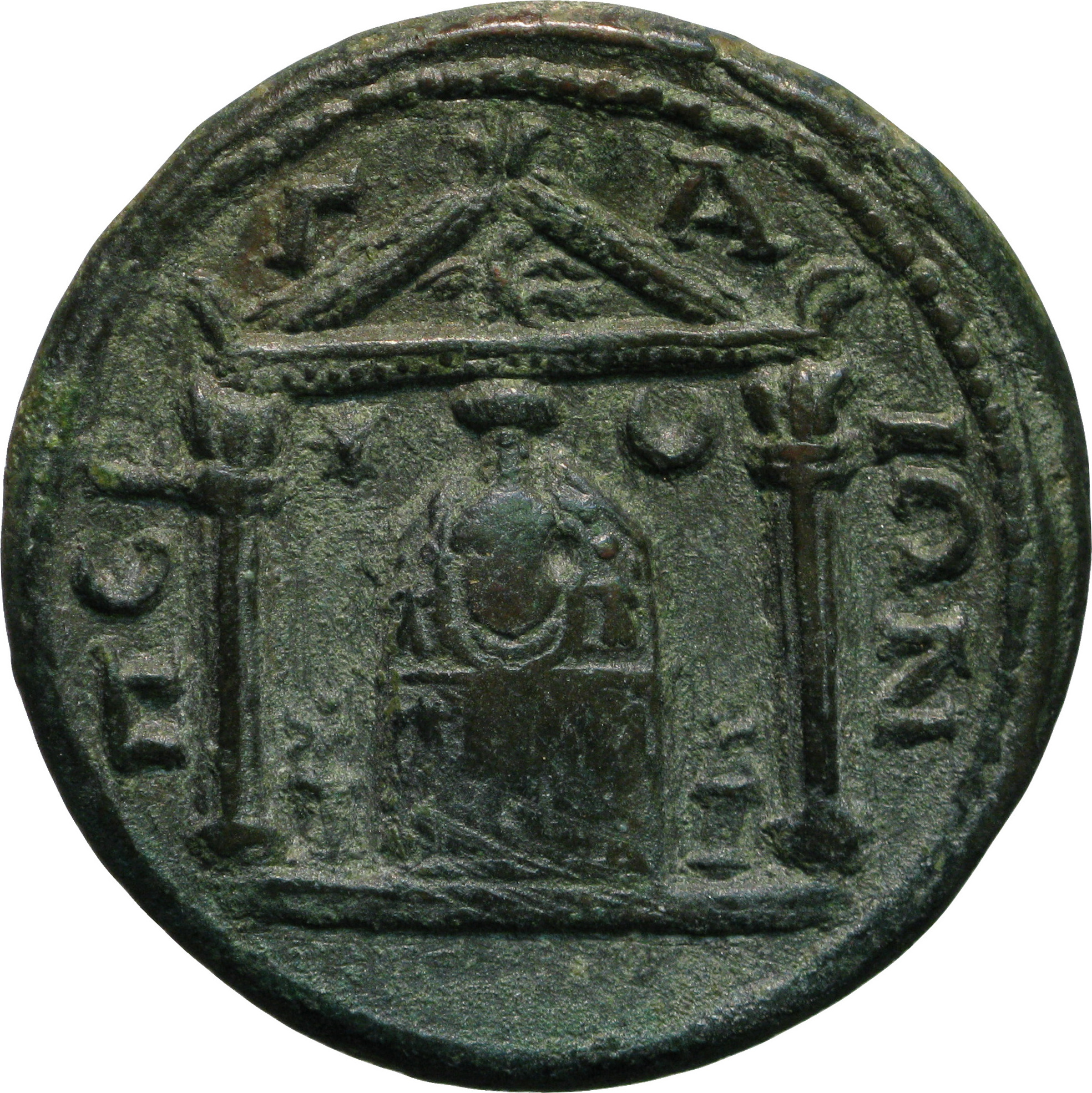 temple with two columns enclosing cult statue of Artemis Pergaia between star and crescent and flanked by two short columns surmounted by sphinxes; eagle in pediment