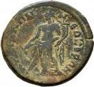 Tyche standing facing, head left, holding rudder and cornucopia