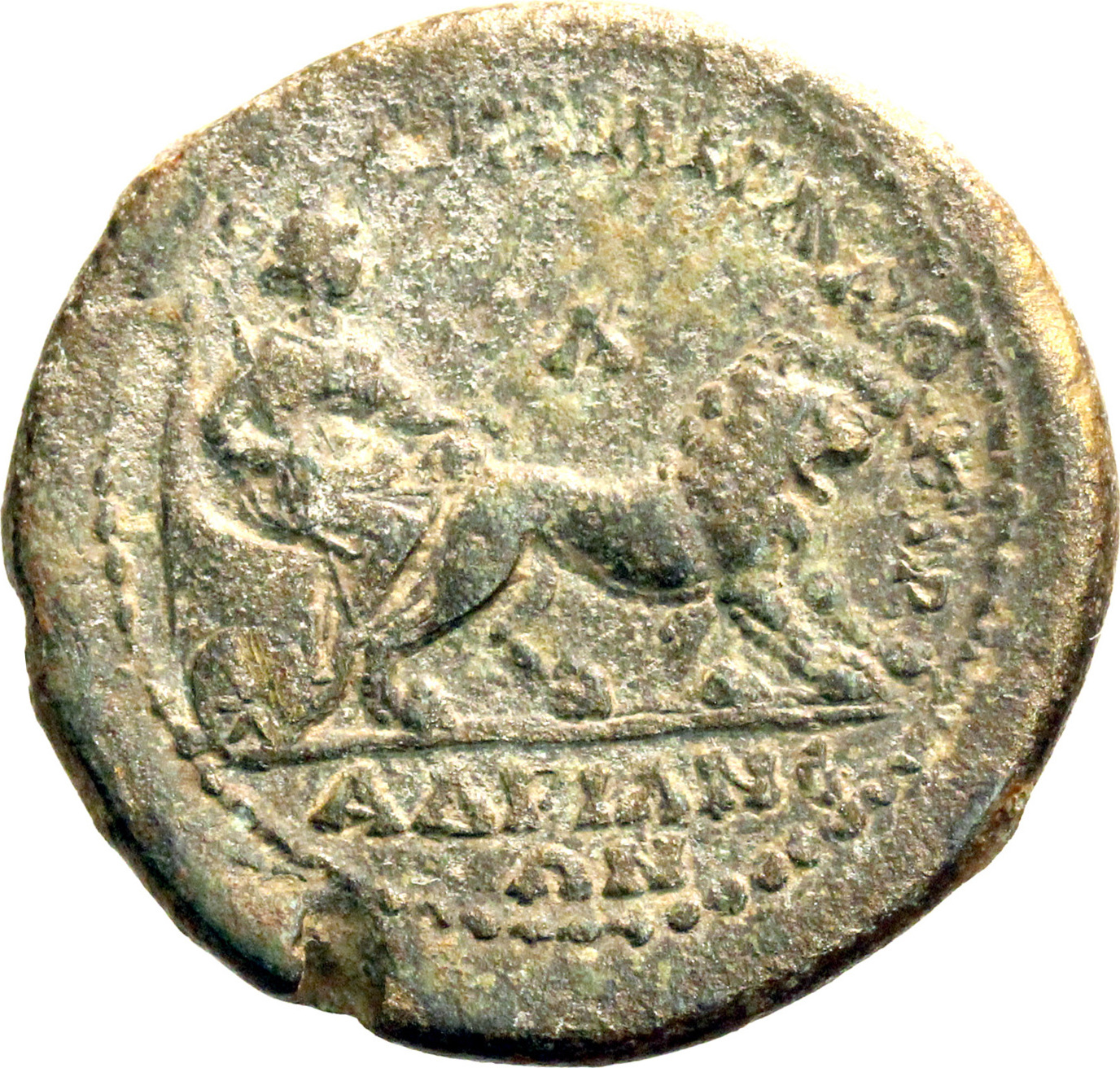 Cybele seated in biga of lions, right, holding sceptre and tympanum |