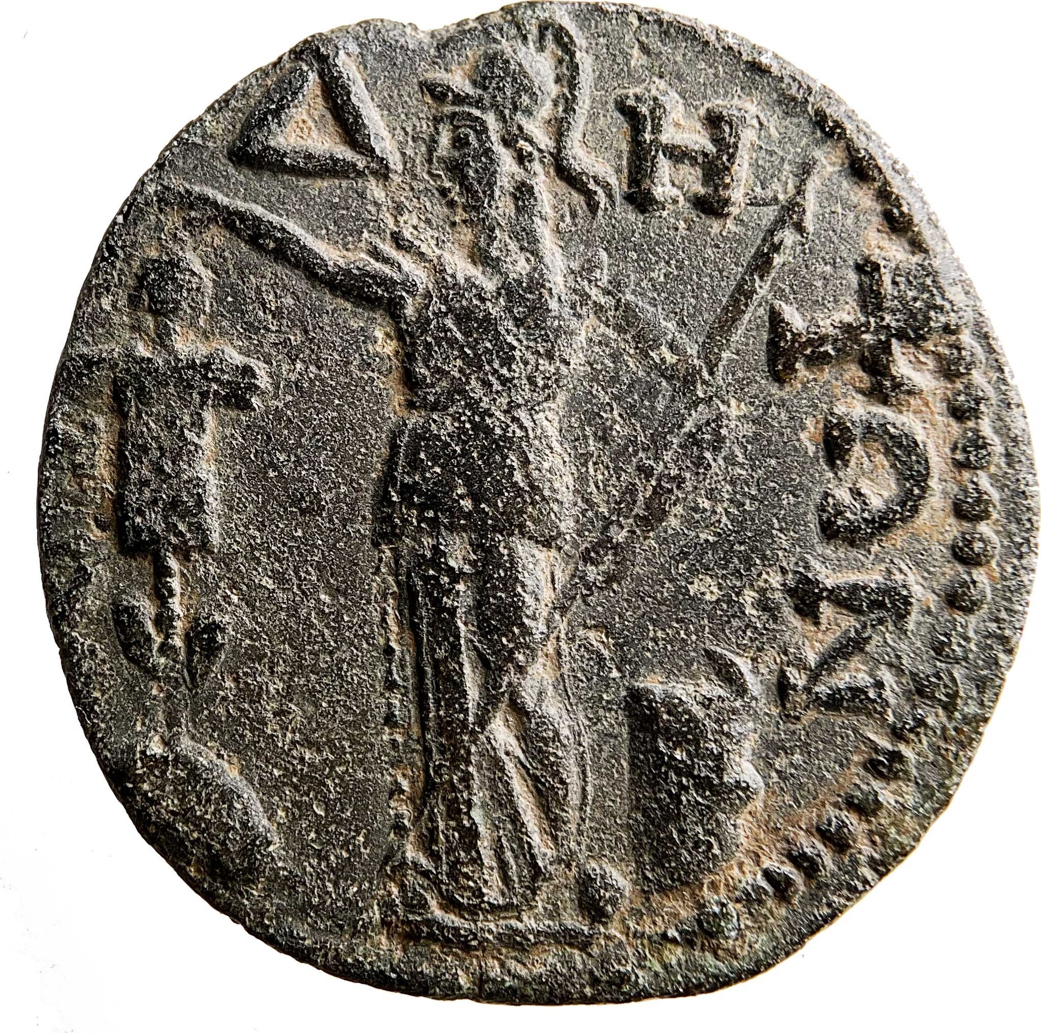 Athena standing, facing, head, right, crowning trophy, holding thunderbolt