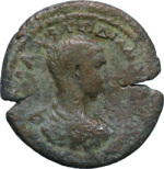 bare-headed, draped and cuirassed bust of Diadumenian, right, seen from rear