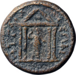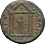 temple with four columns enclosing cult statue of Athena standing right, holding spear and Nike (?); at feet, owl on cippus and shield