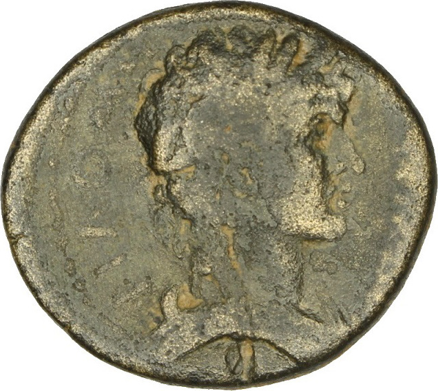 laureate and draped bust of Demos, right