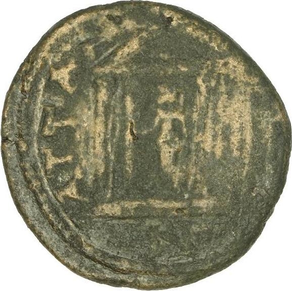 temple with four columns enclosing statue of Athena standing, left, holding Nike over owl and spear; beside, shield