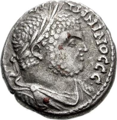 laureate, draped and cuirassed bust of Caracalla, right, seen from front