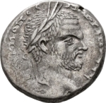 eagle standing facing, head and tail left, with wings spread, holding wreath in beak; small horned altar between the eagle's legs; wreath in upper right field |