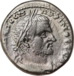 eagle standing facing, head left, with wings spread, holding wreath in beak; small horned altar between the eagle's legs; shrine in upper right field |