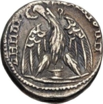 eagle standing facing, head left, with wings spread, holding wreath in beak; small horned altar between the eagle's legs; filleted wreath in upper right field |