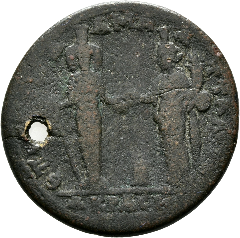 cult statue of Artemis Ephesia facing, with two arms supports, on the left; on the right, tyché standing facing, head left, holdind patera over lighted altar and cornucopia |