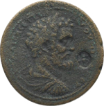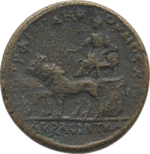 Cybele seated in biga drawn by two lions, left, holding patera and resting arm on tympanum |