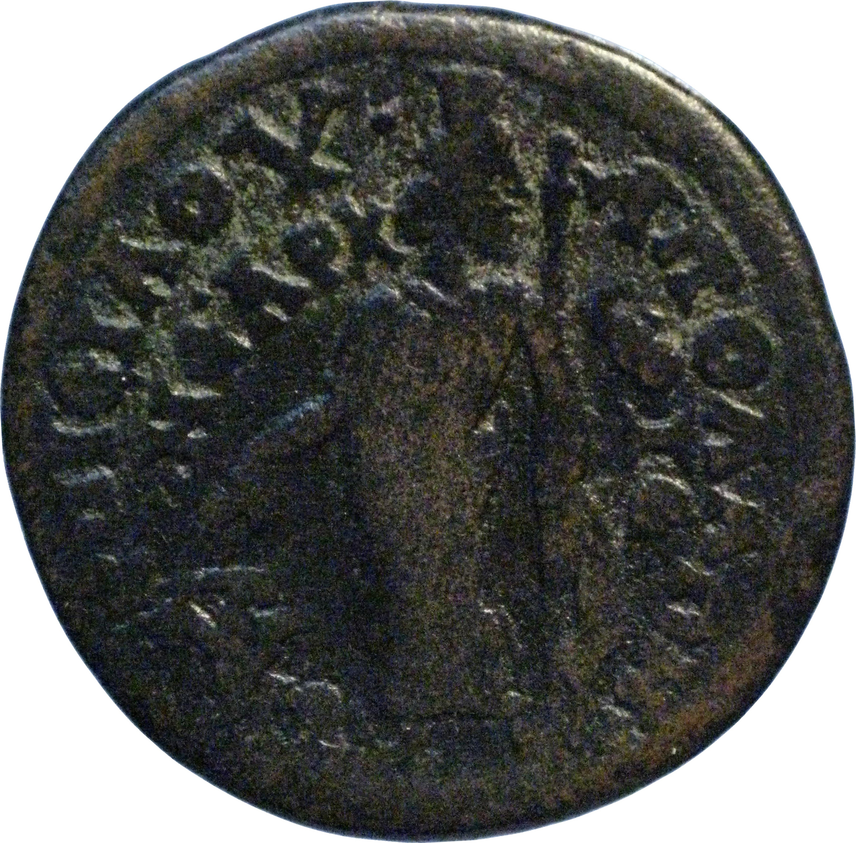 Hades-Sarapis in long chiton and himation, standing facing, head right, left hand resting on sceptre, extending right hand over Cerberus at his feet |