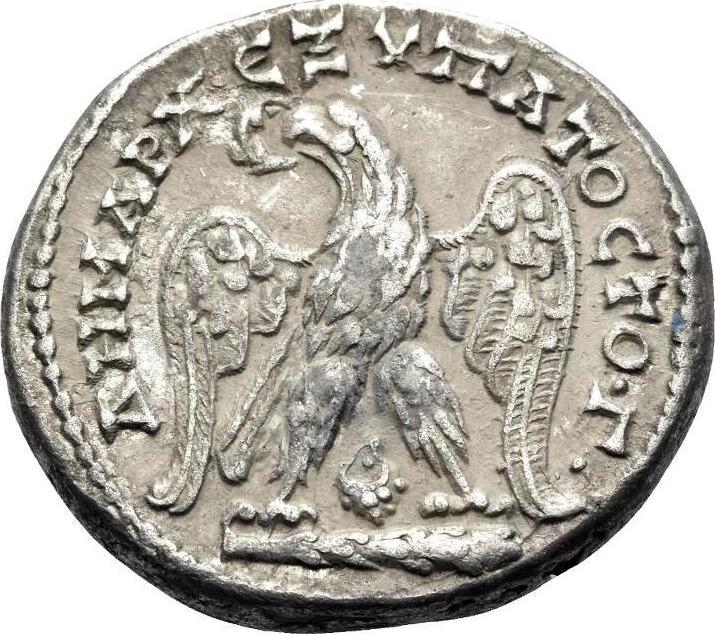 eagle standing facing on club, head and tail left, with wings spread, holding wreath in beak; murex between the eagle's legs
