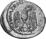 eagle seen from front, with wings spread, head right, wreath in beak; between legs, rectangle of uncertain meaning