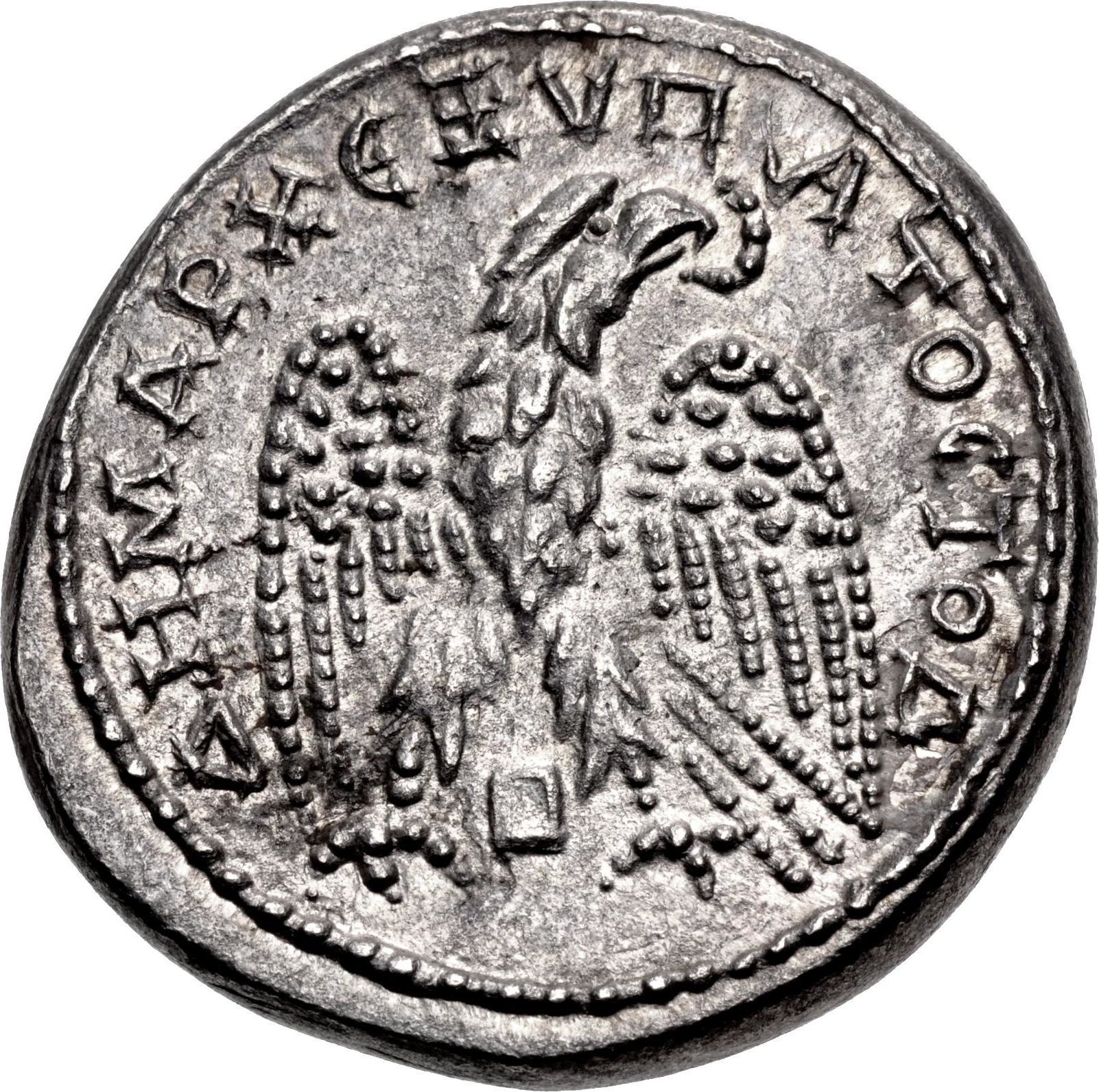 eagle seen from front, with wings spread, head right, wreath in beak; between legs, rectangle of uncertain meaning