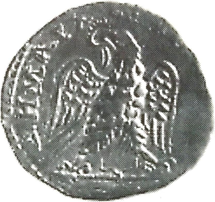 eagle seen from front, with wings spread, head left, wreath in beak, standing on filleted thyrsus
