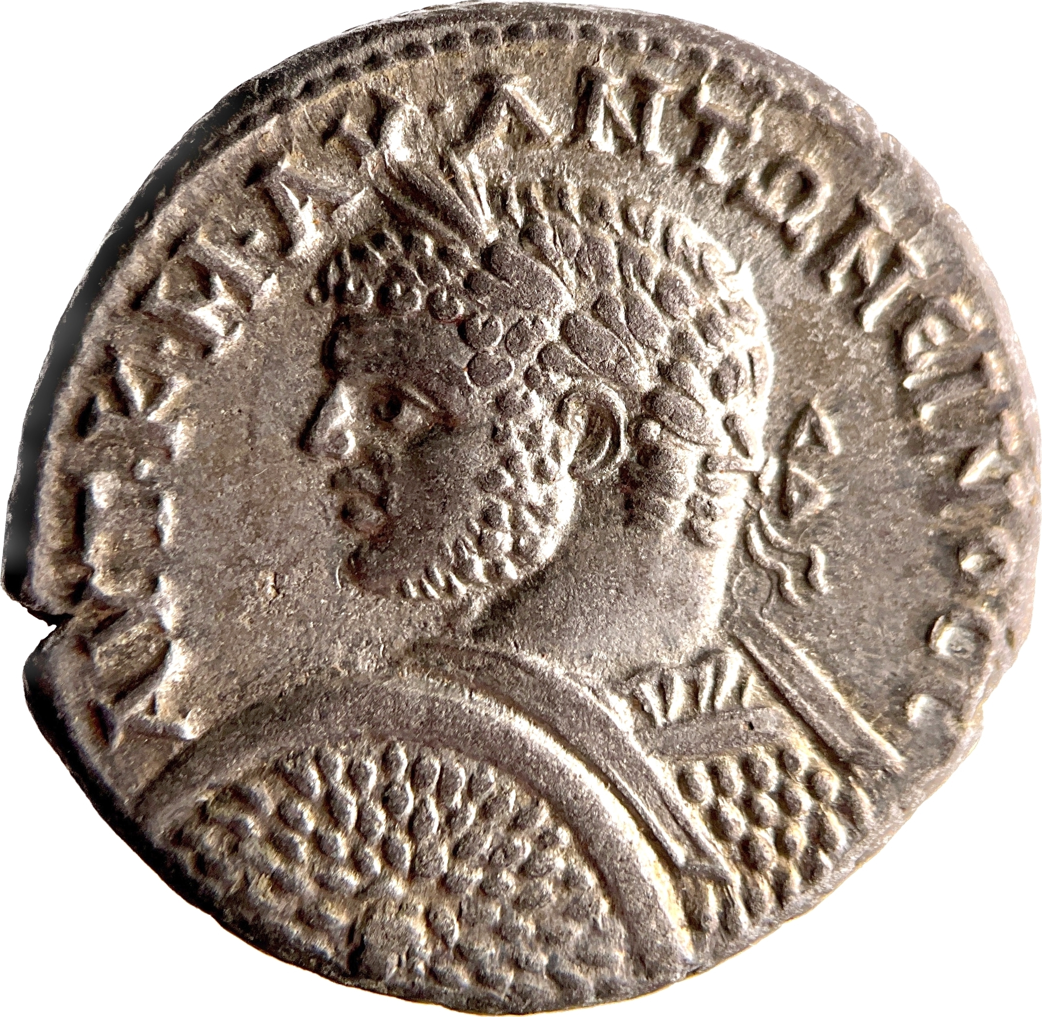 laureate and cuirassed bust of Caracalla, left, with shield decorated with gorgoneion on left shoulder, seen from rear