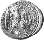 eagle seen from front, with wings spread, head and tail right, wreath in beak; between legs, shrine with pediment