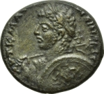 laureate, draped and cuirassed bust of Caracalla, left, seen from front, holding sceptre on right shoulder and shield (decorated with gorgoneion) on left |