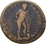 Heracles standing facing, head right, resting on club with his right hand, lion skin on his left arm; below, bow |