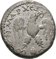 eagle seen from front, with wings spread, head right, wreath in beak; between legs, shrine with pediment