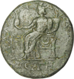 Tyche of Perge seated left, holding small cult statue of Artemis Pergaia and cornucopia |