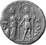 Athena standing facing, looking right, holding spear, at feet shield, and clasping hands with Apollo Sidetes standing facing, looking left, holding long sceptre