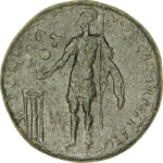 emperor in military dress standing facing, head left, holding patera in his right hand over tripod and spear in left |