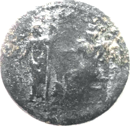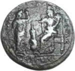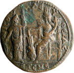 Demeter standing facing, head right, holding ears of corn in her right hand, her left resting on torch facing Tyche seated left resting on rudder set on male bearded head facing left with her right and holding cornucopia in her left