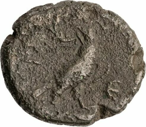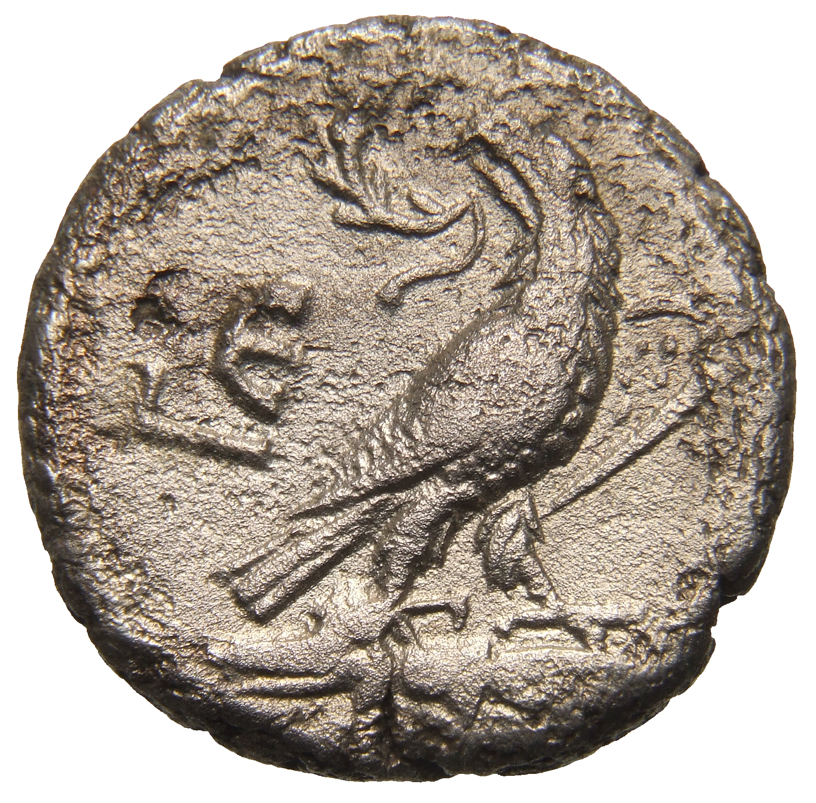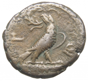 eagle standing right, head left, on thunderbolt, wreath in beak, wings closed
