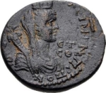 turreted, veiled and draped bust of Tyche right, cornucopia on right shoulder |