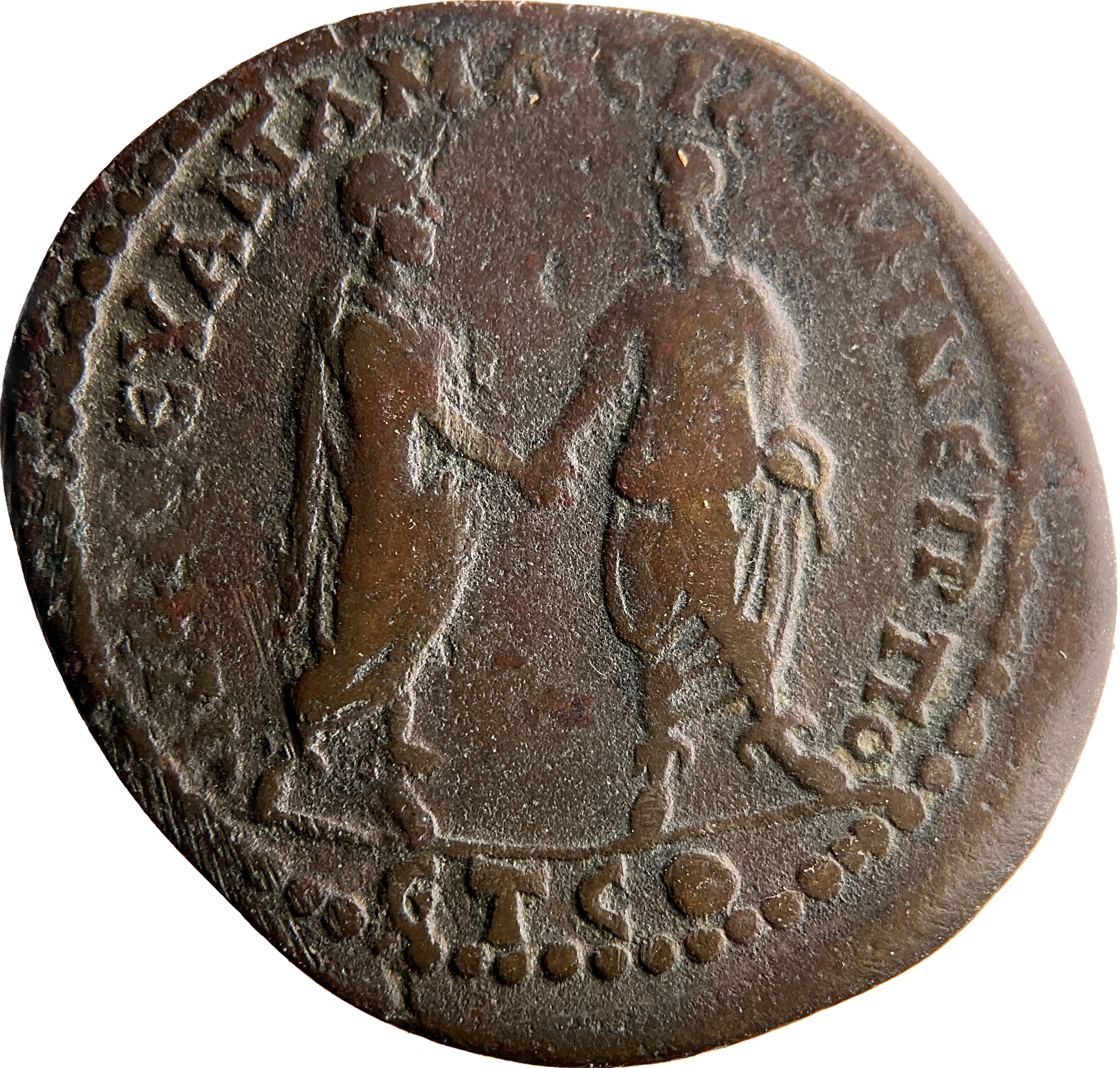 Caracalla and Geta in toga standing looking at each other, clasping right hands |