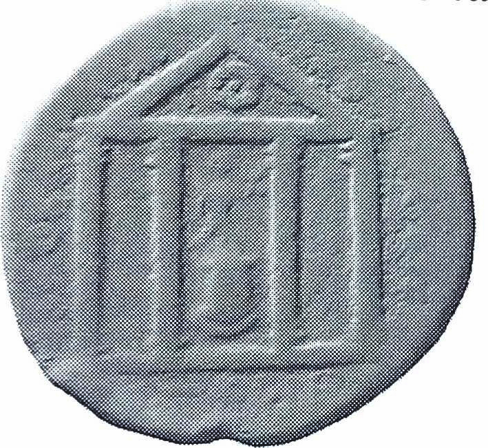 temple with four columns with sacred stone of Mâ on top of which Nike holding wreath and palm, right; disc in pediment