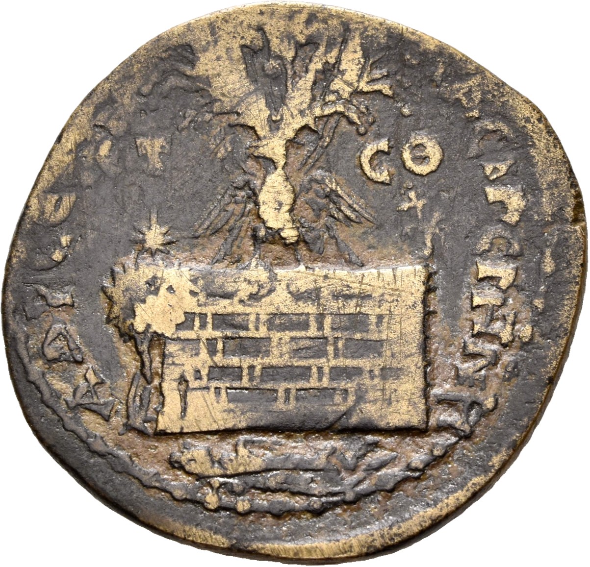 high altar surmounted by eagle standing facing, wings spread, head left, and facing quadriga of Helios; to left, tree |