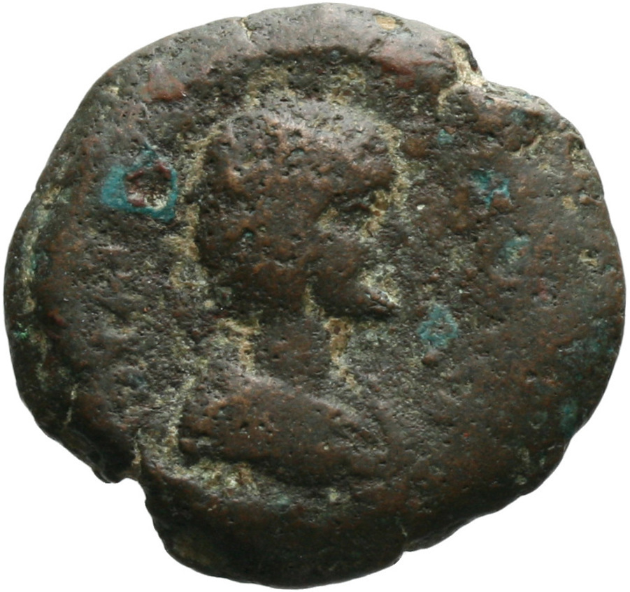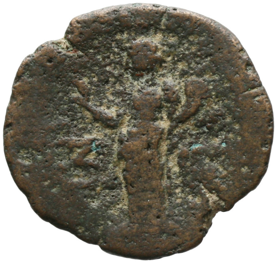 Homonoia standing facing, head left, raising arm and holding double cornucopia