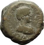 bare-headed, draped and cuirassed bust of Geta, right, seen from front