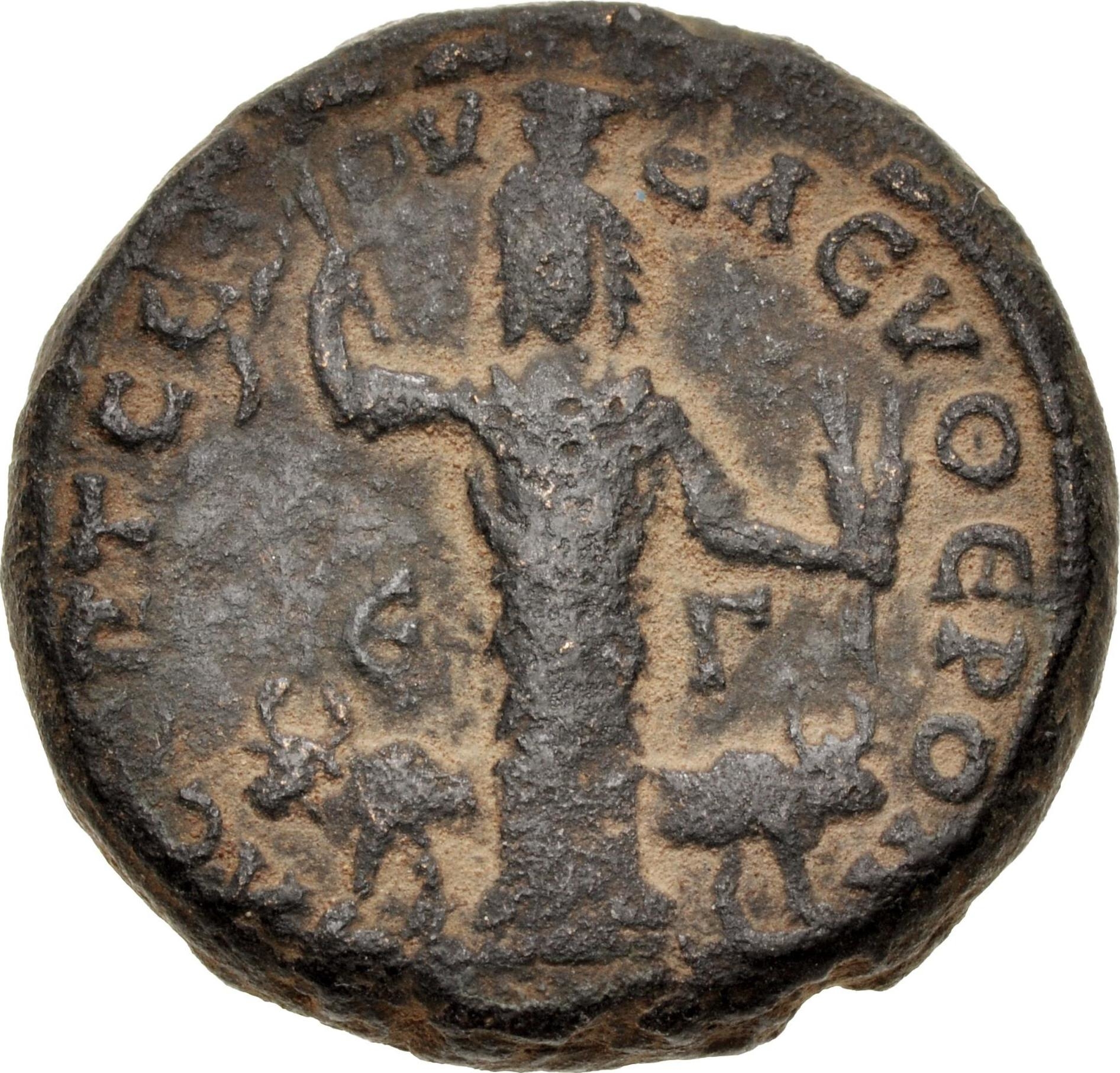 Hadad (Zeus of Heliopolis) standing facing, wearing kalathos, holding whip in right hand and corn ear in left, flanked by two bulls; date across field |