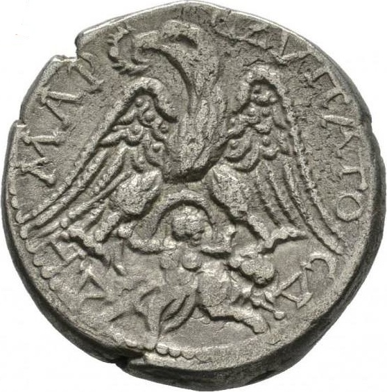 eagle standing facing, head (and tail?) left, with wings spread, holding wreath in beak; between legs, Europa on bull right